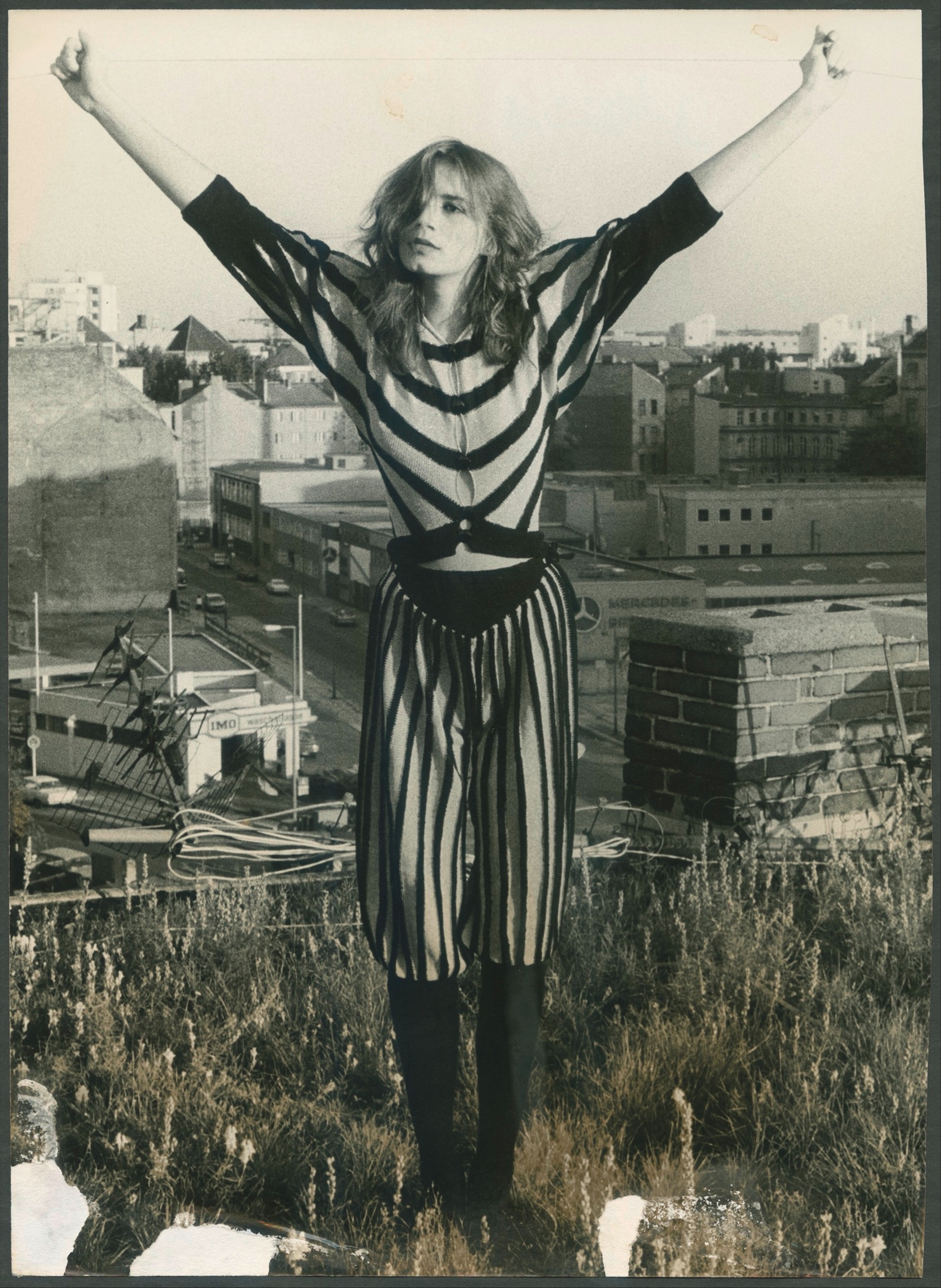 In the late 1960s the only place to shop for clothes in West Berlin was C&A, (2) so to find something extravagant or extraordinary we had to travel to Amsterdam or London. I had been knitting a bit for some boutiques — sewing felt too close to my father. I wanted a pair of knitted pants, so I bought a knitting machine. The actors from Theaterforum, which put on Peter Handke (3) plays, started ordering my stuff. [André] Courréges was hot at that time, and I was making white pleated bell bottom pants that came with a matching zipper jacket, like the ones the mods were wearing. All the wool shops in town only really catered to grannies, but one day we found a supply of thin yarn in all colors. We used it for dresses and mixed it with Lurex. People were crazy about it. A knitting machine had nothing to do with our grandparents’ world. Our style icon was Talitha Getty: hippie de luxe. And we did not overintellectualize. We wanted to look sharp and go out and party. At some point, years later, all the DJs in Berlin were wearing my knit pants. They were comfortable and special.