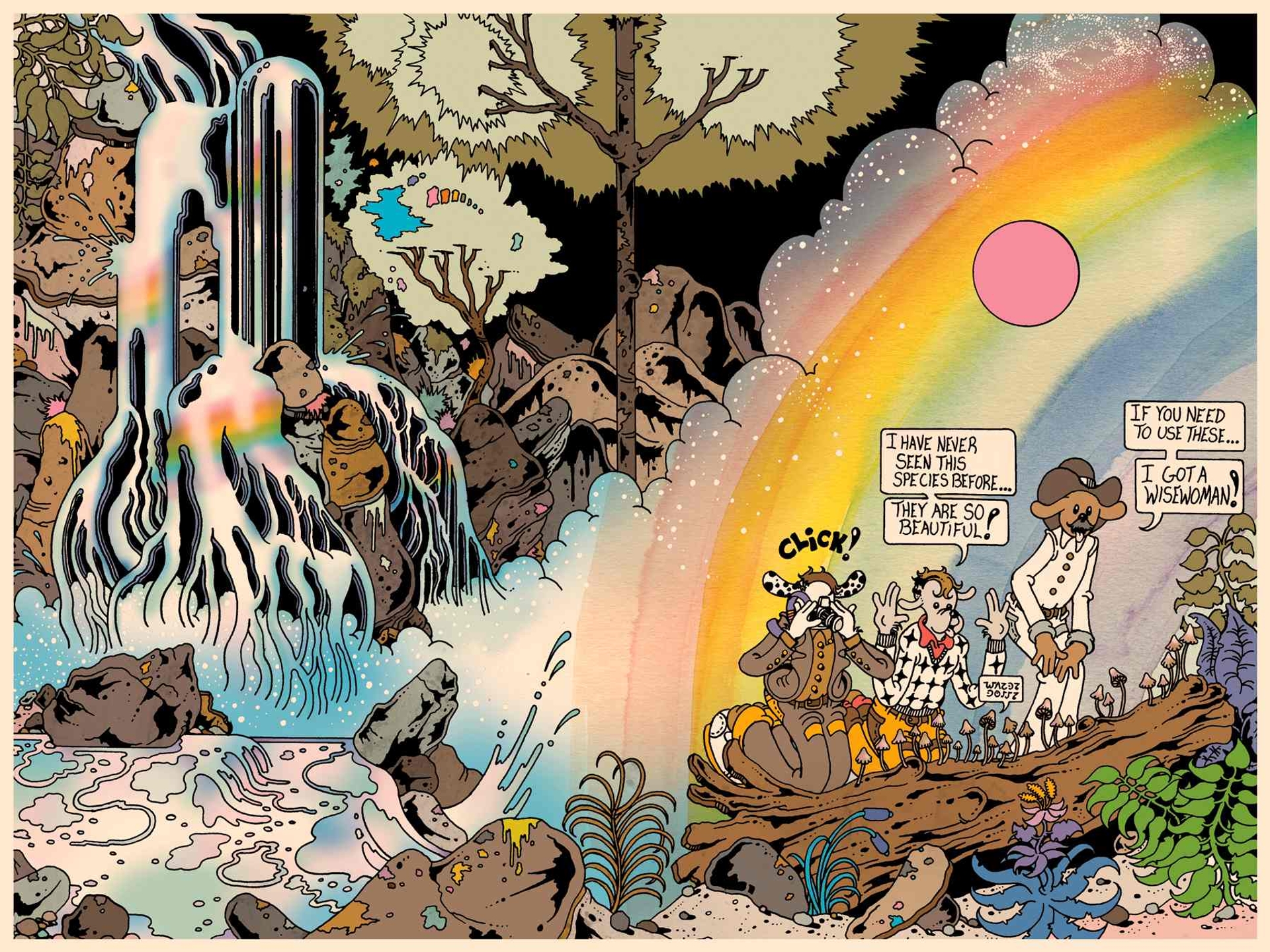 This dynamic becomes an issue on their second visit, when a photographer accompanies Gordon. Wise woman María Sabina agrees to consult the fungi for the Wassons, with the caveat that they keep the experience to them-selves. “Showing the photos or telling anyone,” she says, “would be a betrayal.” The documentation, and the details, soon appear across American newsstands. As high-seeking beatniks overtake Mazatec lands, an elder sets them ablaze, determined to get rid of the colonizers. By the time nature is restored, María Sabina can no longer communicate with the mushrooms — but the beatniks can. Blomerth’s characters are rendered with the artist’s signature “dogface” anthropomorphism, traveling between universes, realms of being, and theorems with springy tongues hanging out of their wide-open mouths. It is Blomerth’s visual glimpse into a niche front of American colonialism, where supposedly well-intentioned cultural aficionados become complicit in the exploitation of Indigenous people and lands. The beatniks’ theft of María’s supernatural prowess points a hazy finger at every reader with a penchant for fungal psychedelia: our own highs are direct descendants of those first felt by the snazzily dressed hipster-colonists who appropriated them so many decades ago, and we are no less guilty than they. This lesson is especially relevant considering that the magic mushroom, complete with all its political associations, is “back.” The micro-dosing trend, wherein users take tiny doses of psychedelics to experience mental health benefits (without all the snakes and skulls), banks on the repetition of a much bleaker history: lay waste to a spiritual tradition — for which certain users were probably once punished — repackage it for luxury consumption, then cast it aside for another era to make sense of.