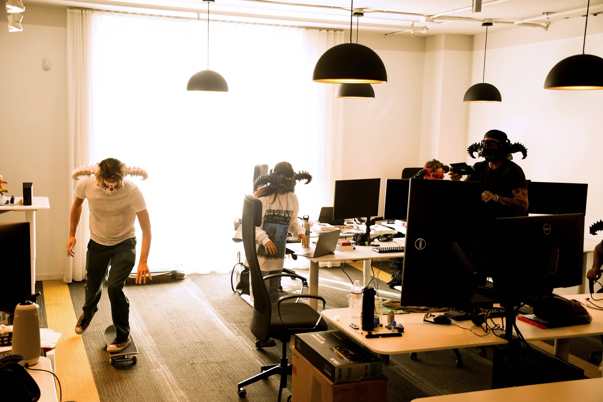 The EDGLRD team in their Miami studio, wearing demon masks that were designed in-house