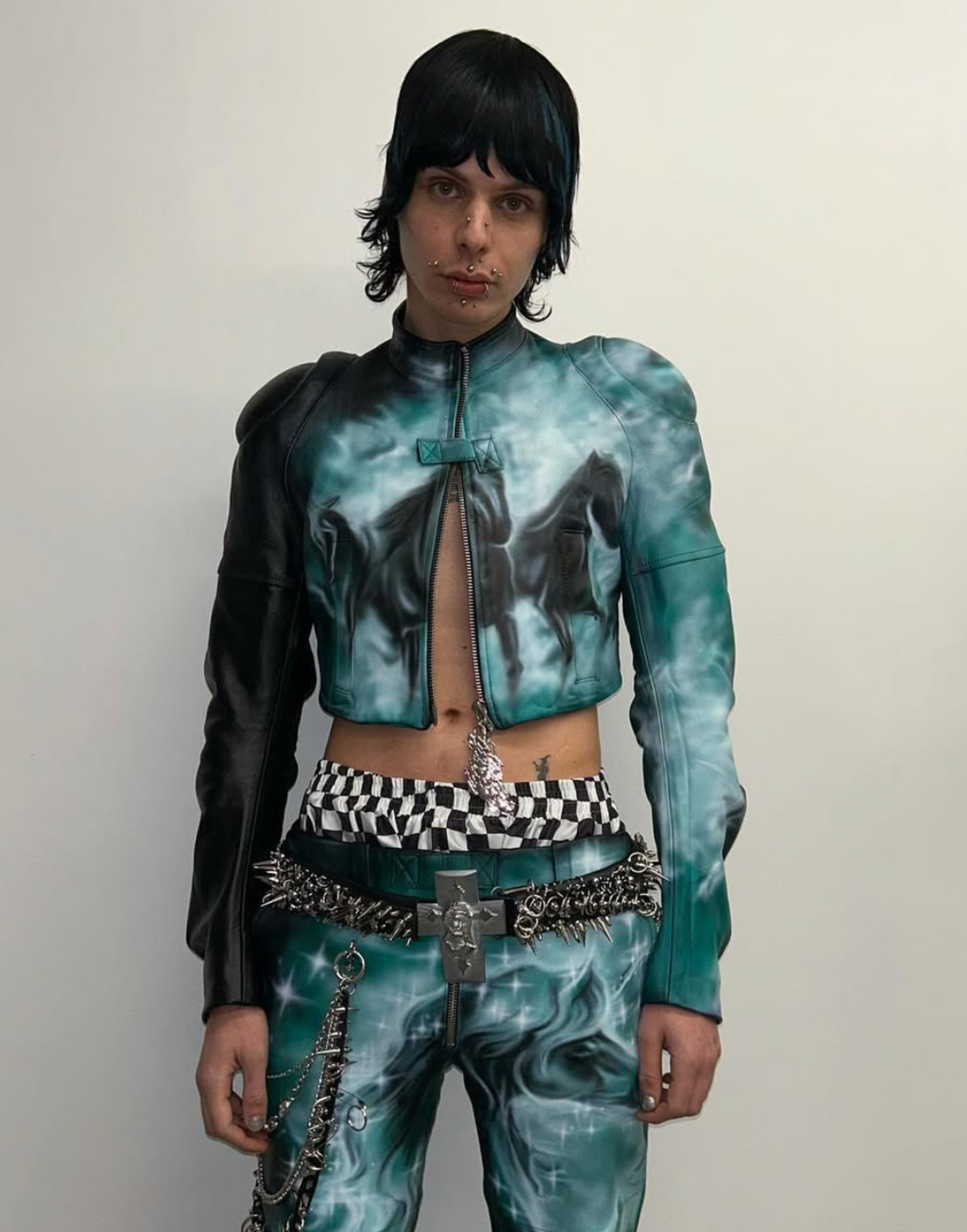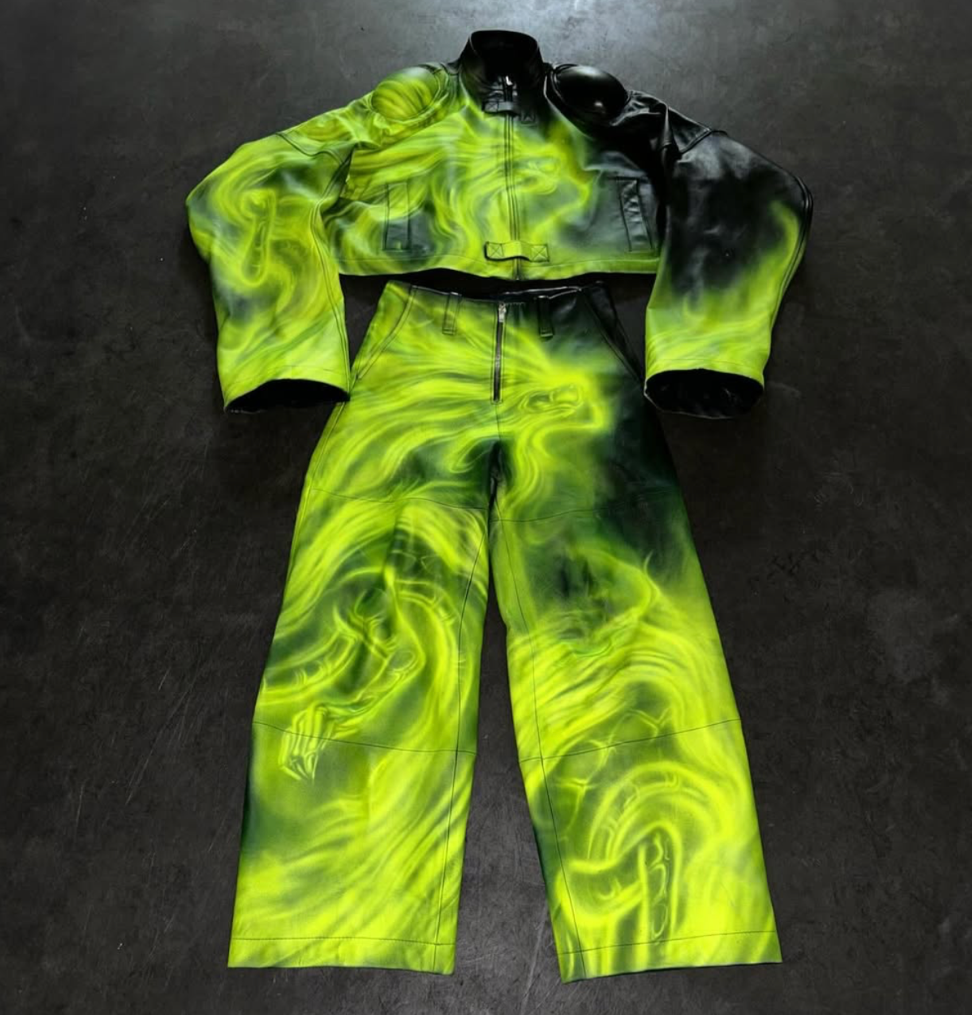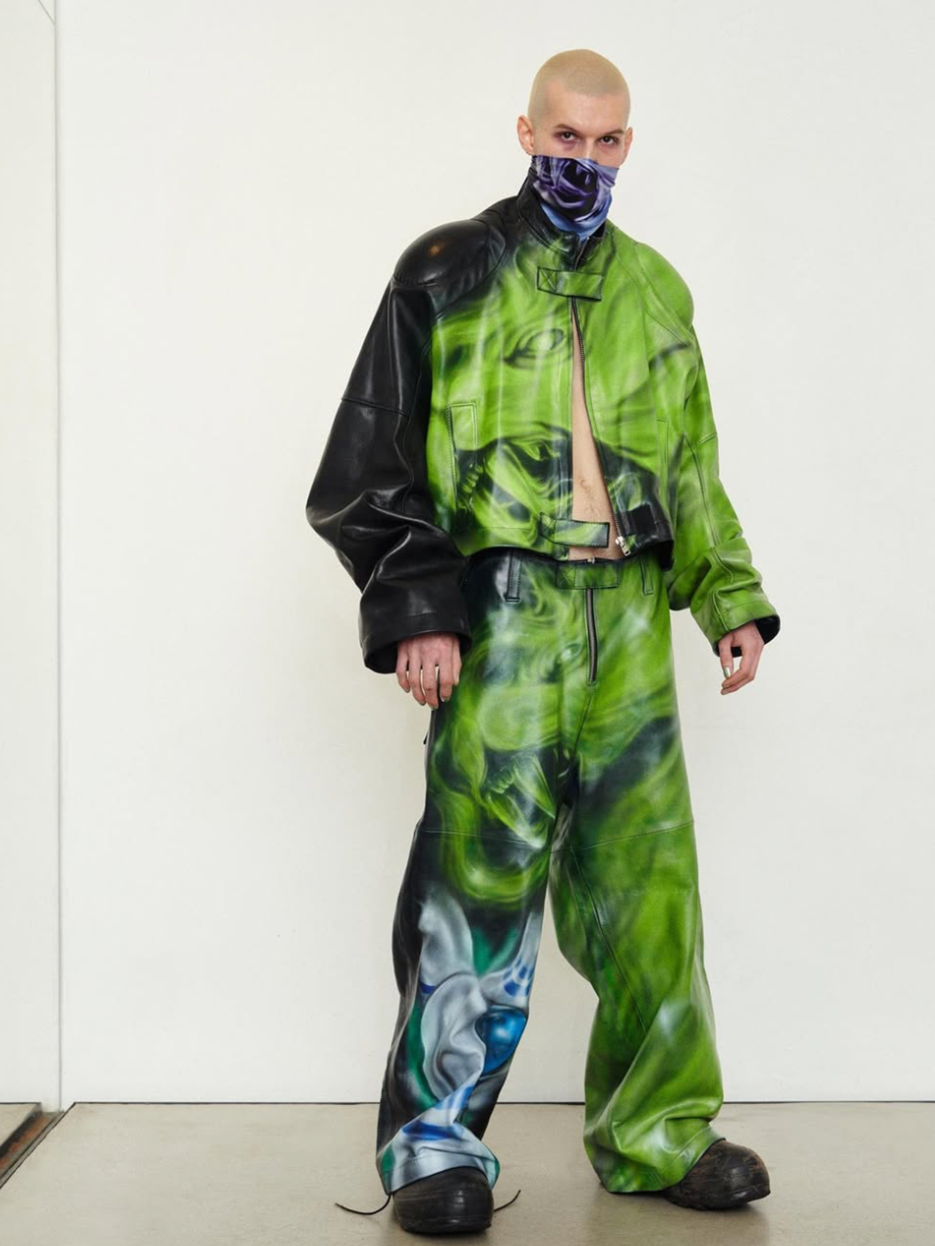 The designs collide rave energy, biker grit, and workwear utility in oversized polychromatic pieces that burst with vibrancy and airbrushed finishes. As a result, the wearer is morphed into an anime-like character, which is no coincidence since Jacob cites Japanese illustrator Satoshi Kon as one of his key aesthetic influences. Yet beneath their playful, hyper-stylized surface, these collections grapple with bleak cultural undercurrents. SS-23 Raised by Wolves, for instance, was inspired by Jim Goldberg’s visual account of homelessness and served as Jacob’s personal vehicle for social and class commentary.