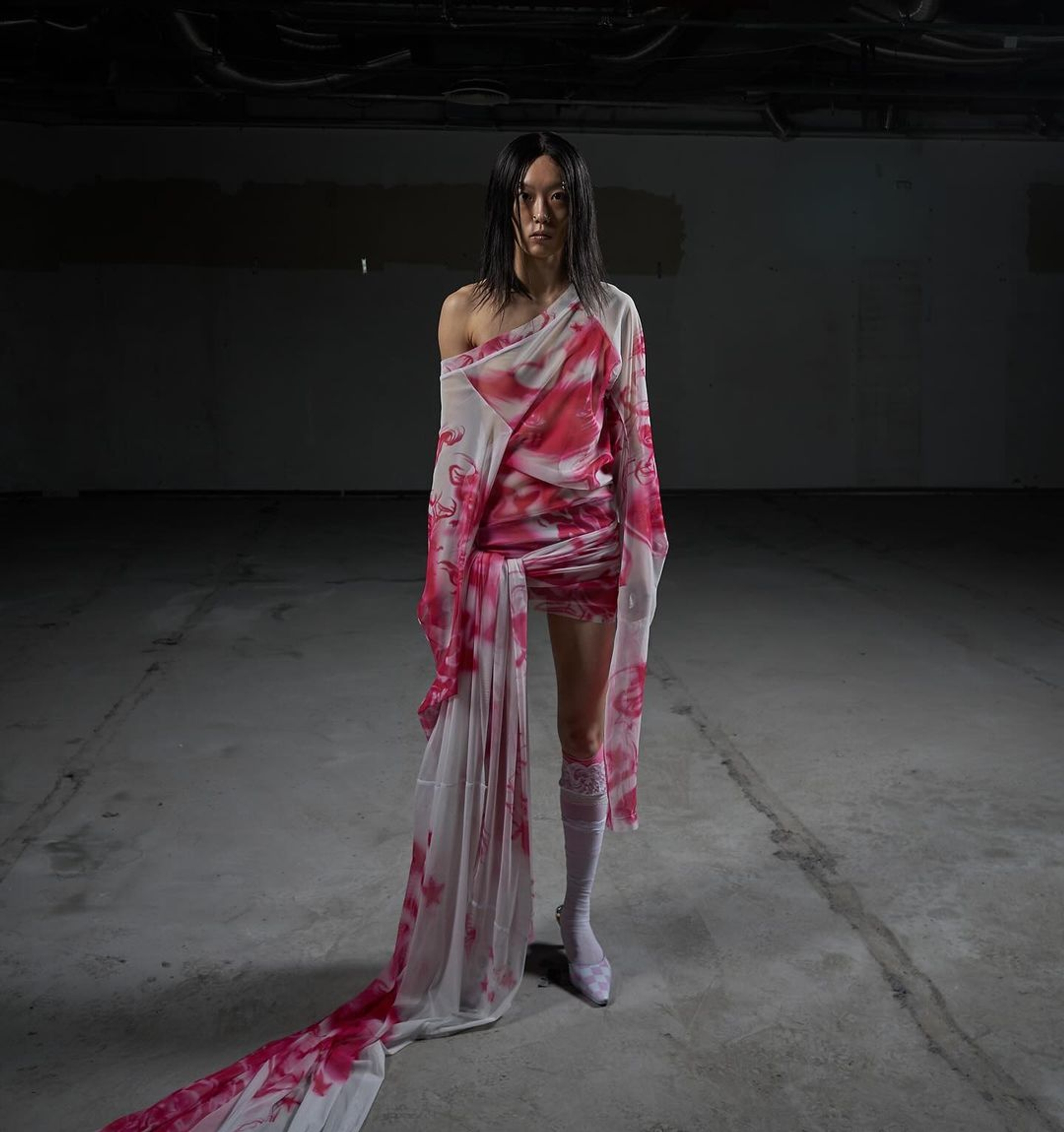 MR: Some of your choices might seem a chaotic at first, as you combine elements that don’t typically go together—you pair airbrush with Japanese satin, and even pearl buttons. How do you harness this chaos?