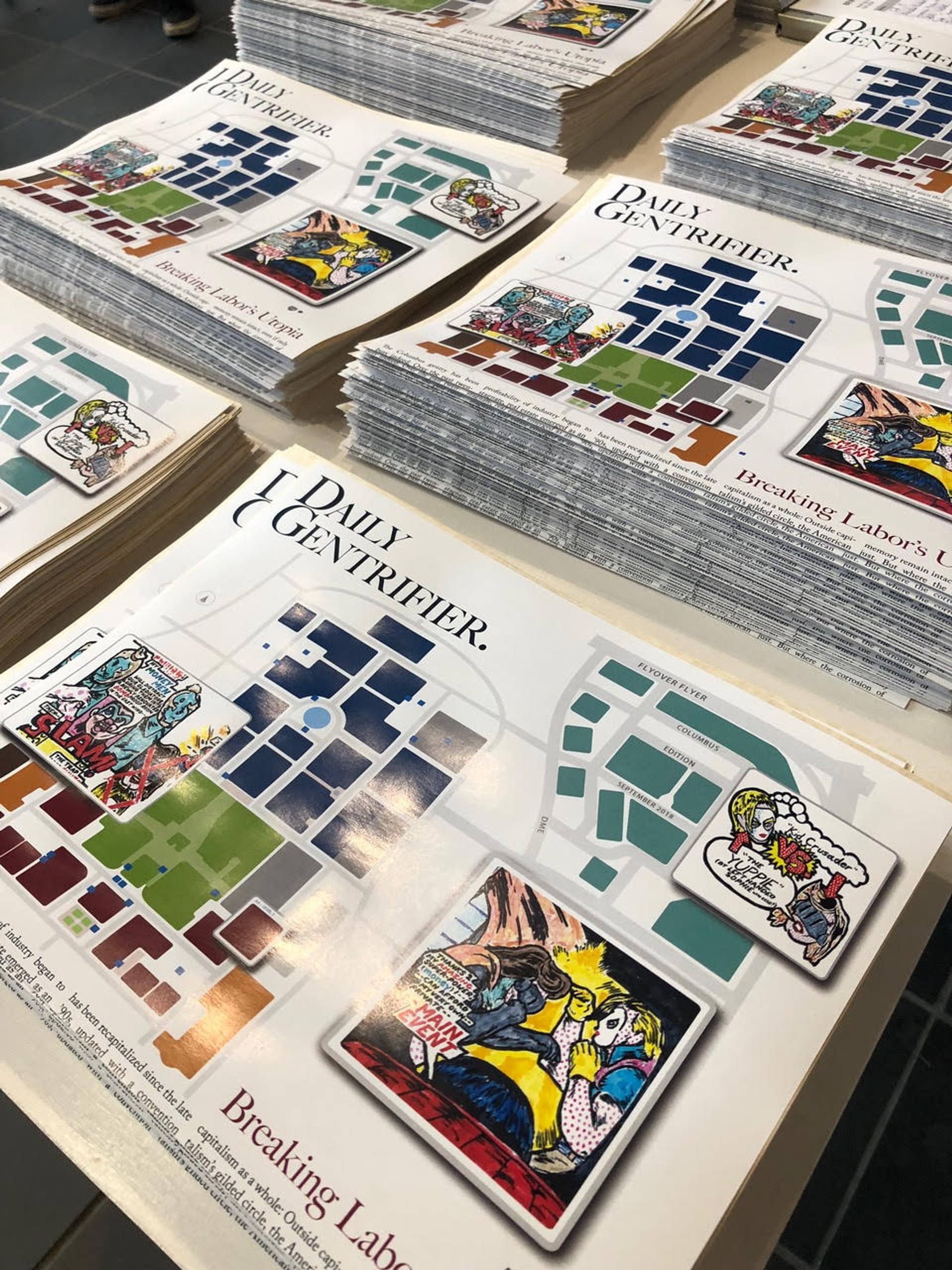 Gentrification fetishizes the local and then slowly eradicates it, so I knew that I wanted to somehow use “the local” as a starting point, to basically reclaim it. And then my particular interest, the only place where I feel like I have any actual leverage, is within the art community, so I wanted to see how each locale’s art communities were responding. Oftentimes, these usually white, usually educated art people are enticed to move into a neighborhood as transitional occupants, to make the neighborhood cool, and then they are later pushed out when higher-earning professionals want in on it. But there are successful methods of resistance, so I’ve made sure to cover the tenant-rights successes of Mariachi Plaza in LA and the Stadium Stompers’ victory against Temple University in Philly, because I don’t want to give the impression that gentrification is completely inevitable and we should just shrug it off.