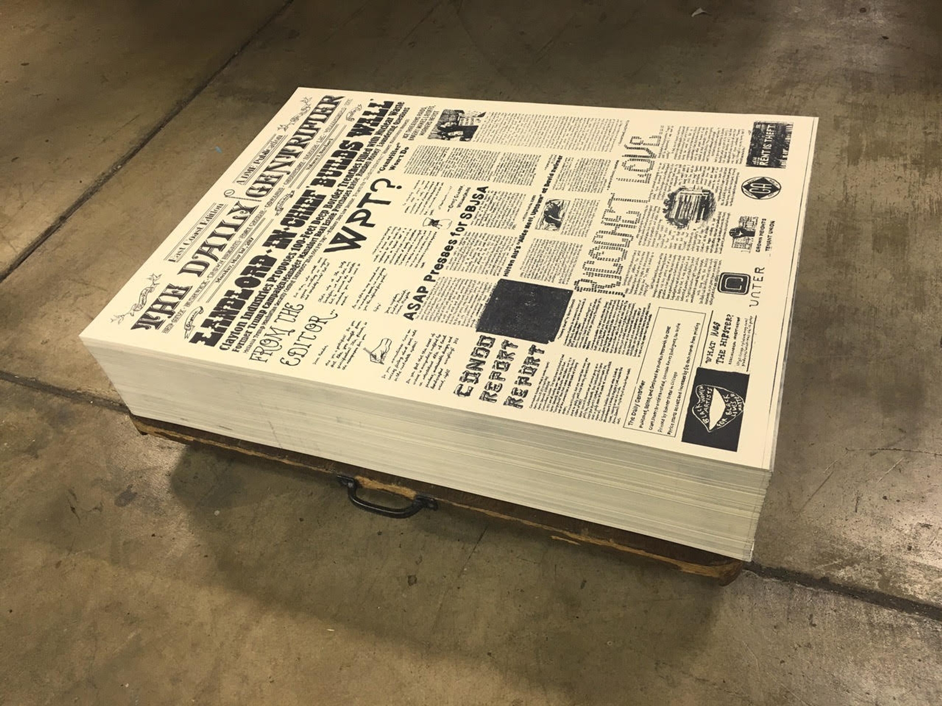 I wanted to make something conspicuous, yes, and awkward. The format is the 20” by 33” – historical broadsheet size – because I wanted to reference the history of newspapers in the 19th century, when they would be posted up in public, often in frontier situations. One of my irritations with the aesthetics of gentrification is that all this old, crafty, vintage, “historical” stuff gets used anti-historically, to cover-up the actual history. So the tactic with this project is to use those fonts, use the letterpress, use the old-timey format to actually speak frankly about what is going on when neighborhoods get gentrified. To really draw a line to the historical settler colonial aesthetics that are constantly being referenced in gentrification.