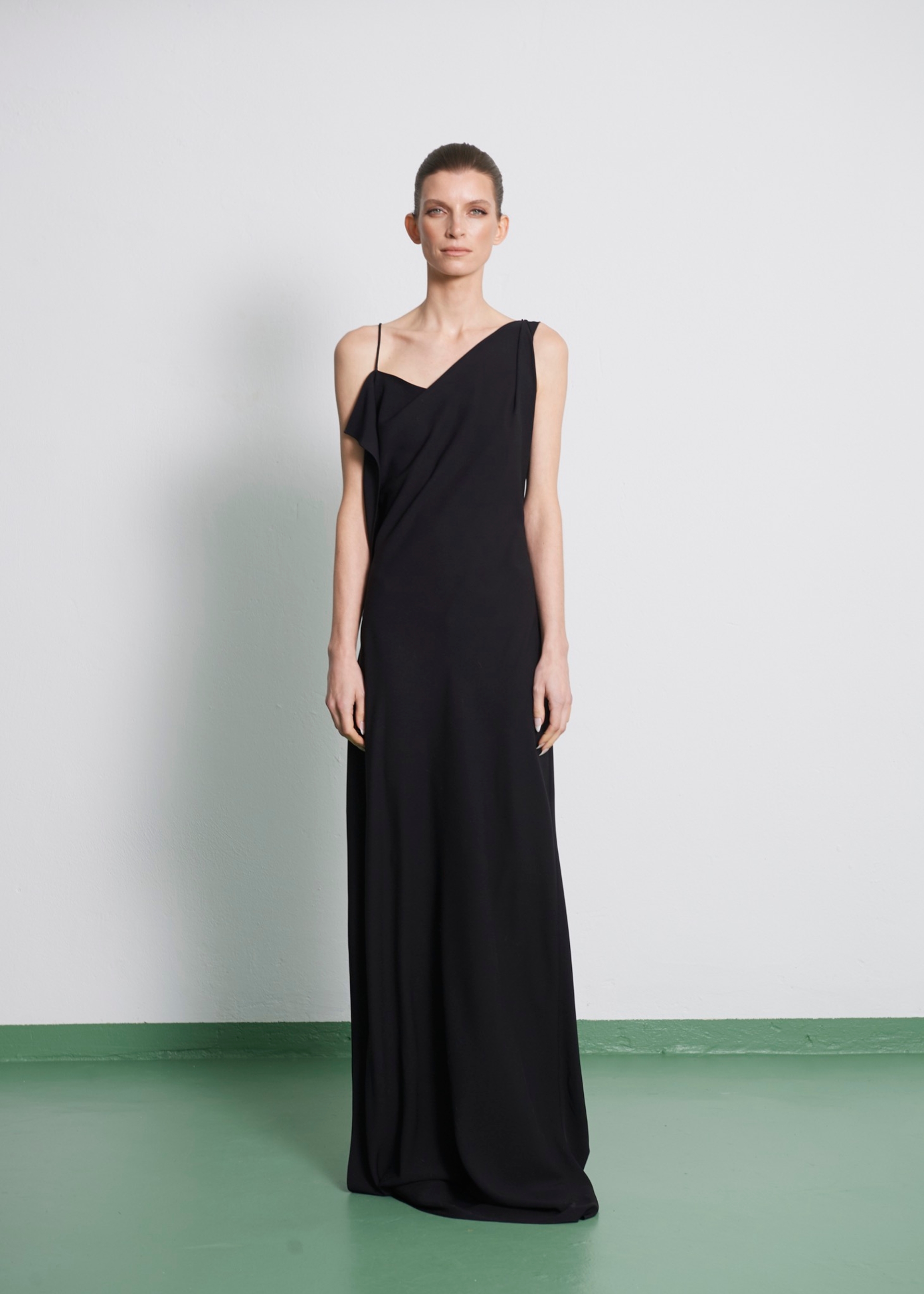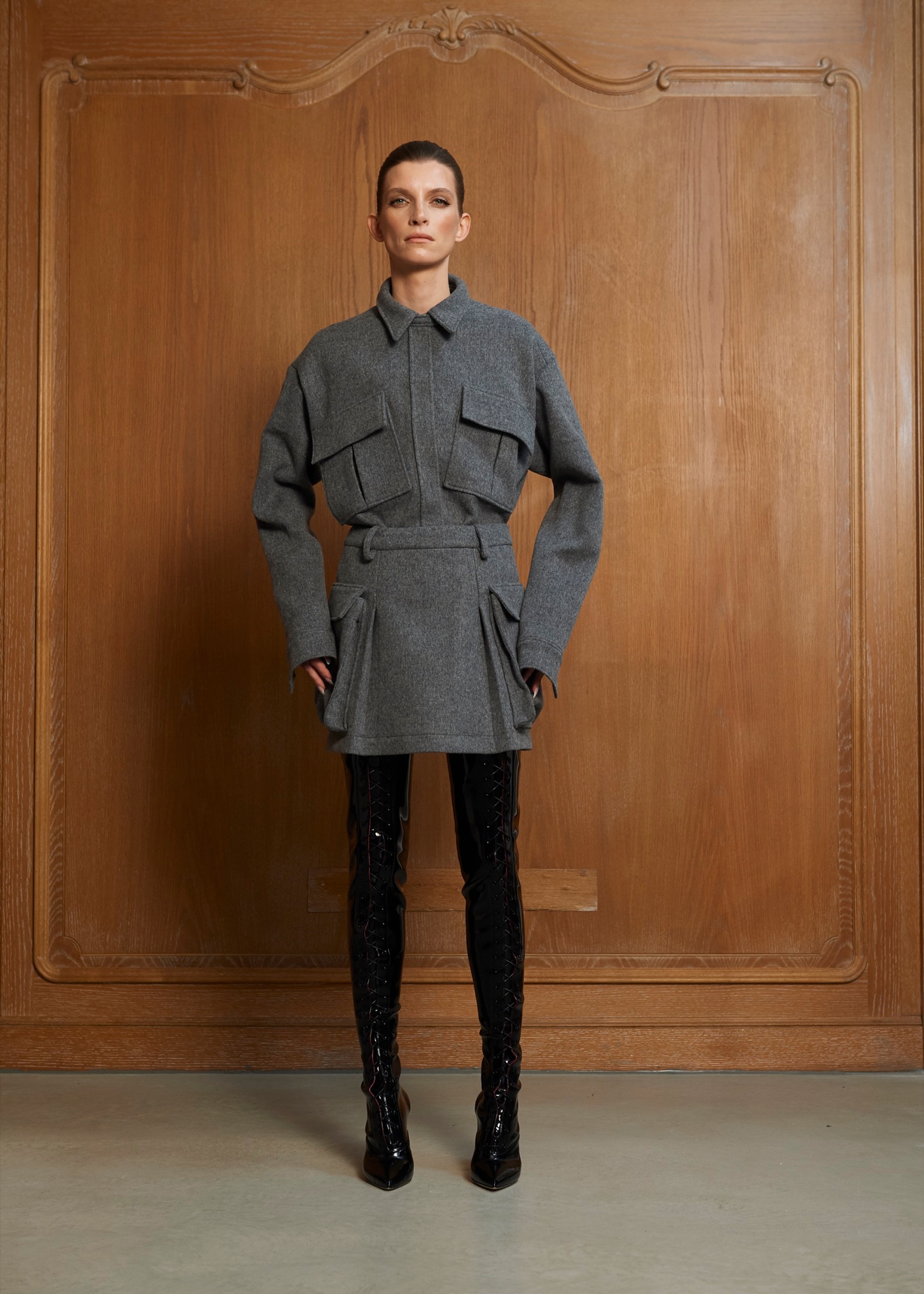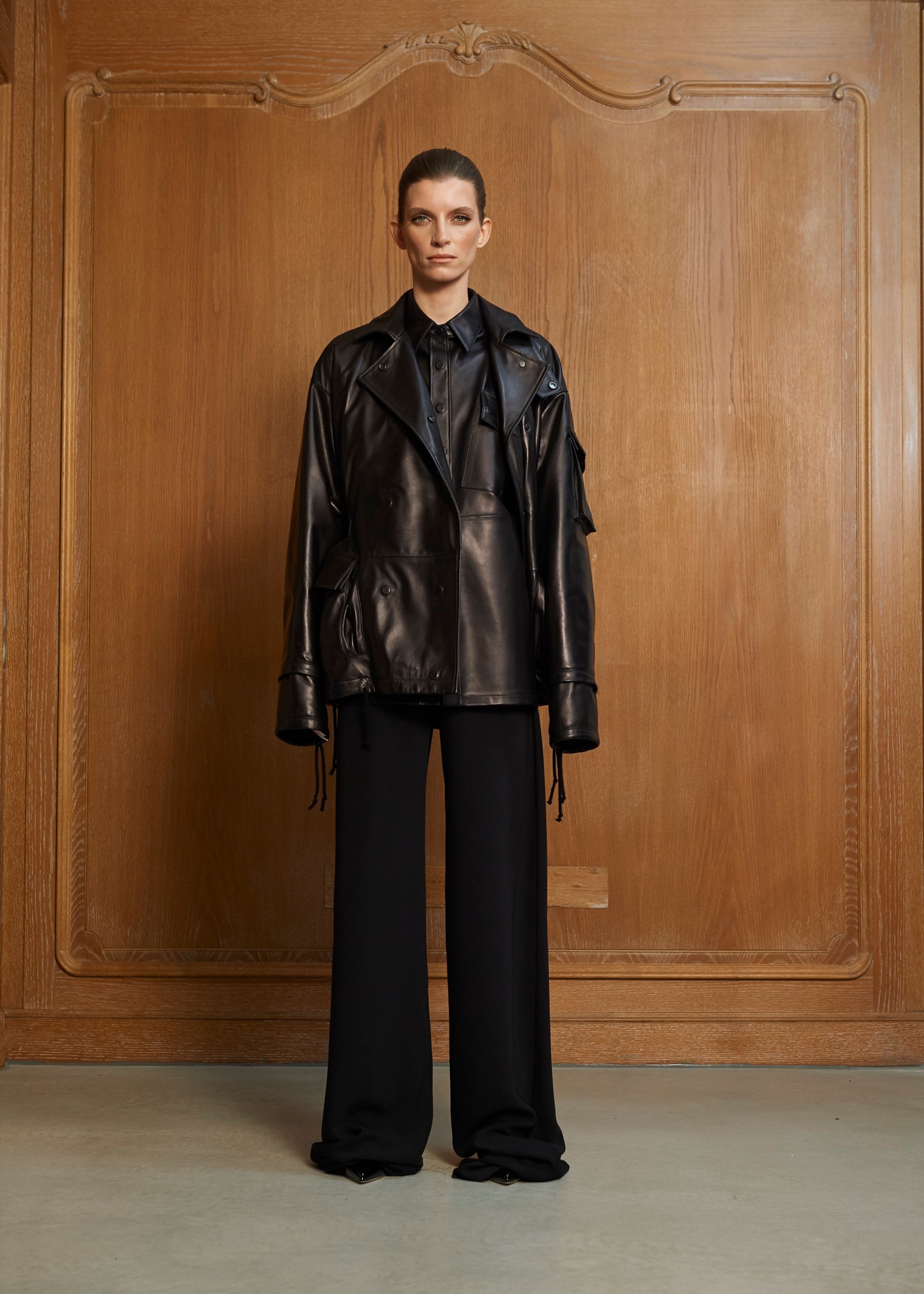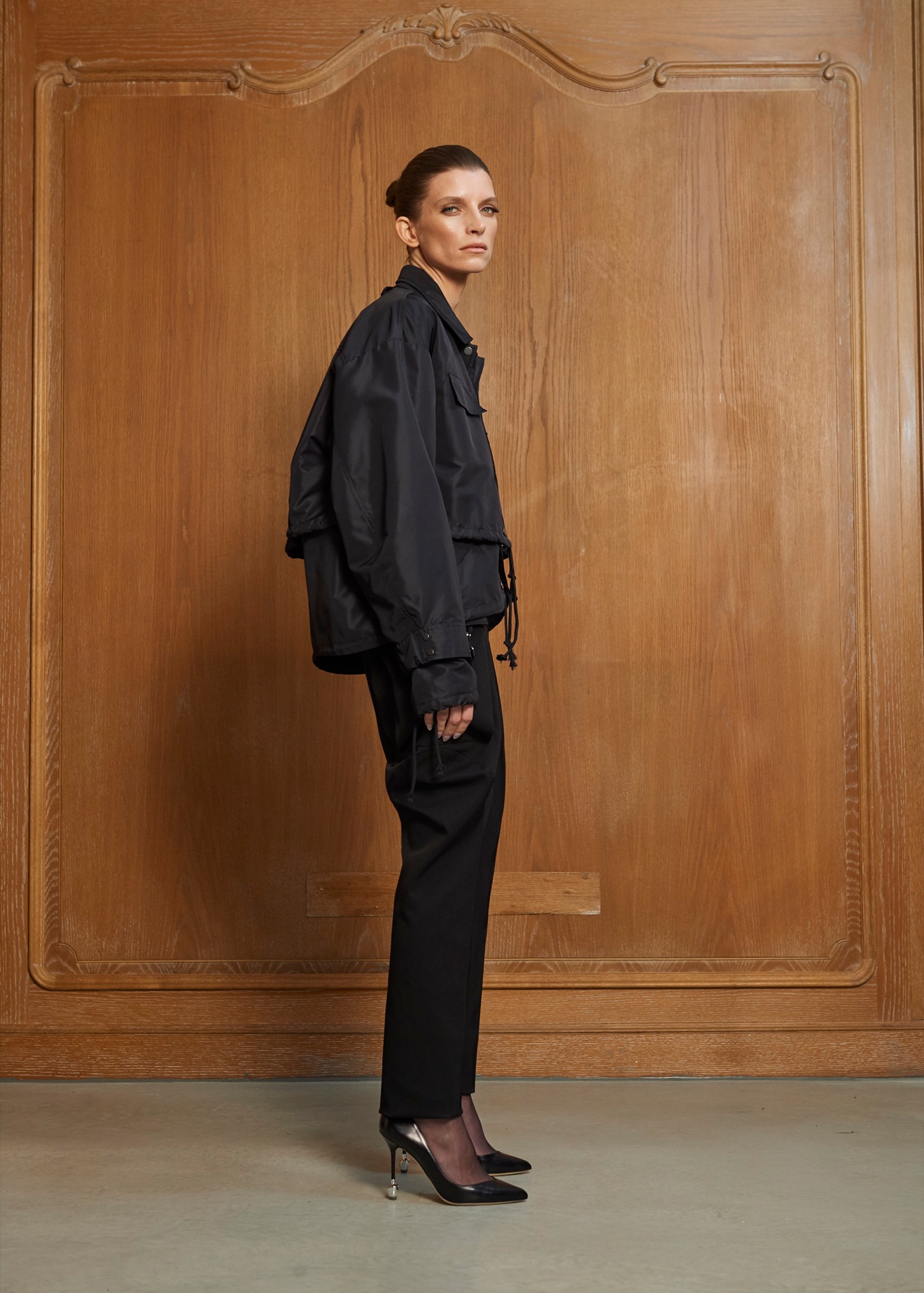 The collection emphasizes material and technical quality, which is energetically revealed and concealed. Counterintuitive pairings of fabrics and design subvert classic garments such as the white button-up shirt or the little black dress. Bonded buttons and trompe l’oeil layers in outerwear veil functional details and structure, while external darts and visible tailoring expose them. Contrasting textures and shapes pair soft draped tops and dresses with sculpted leather and canvas volumes. Fabrics associated with functional clothing are reinterpreted in elegant evening attire, referencing 032c’s background in workwear in the context of luxury standards. Asymmetrical cut-outs and lush Swarovski Crystal embellishments elevate and complicate otherwise stark silhouettes, adding a sense of accident and excess to the garments’ rigor and intention. Heritage production methods are adapted for contemporary fabrics benefiting from new technology and environmental guidelines. Ethically sourced fabrics feature prominently: a GOTS-certified fur alternative by the German brand Steiff appears as an evening dress and a classic, military-cut winter coat.