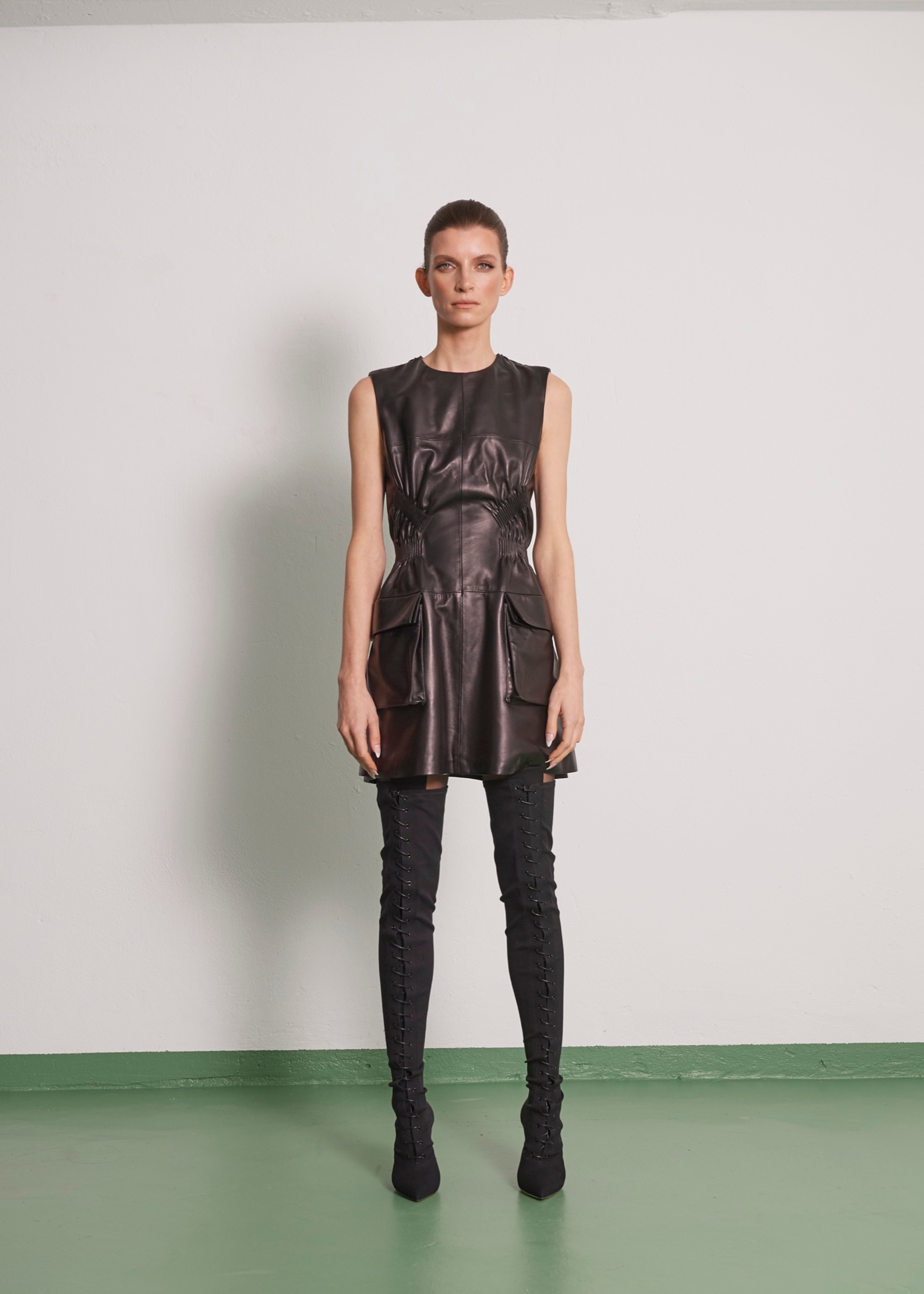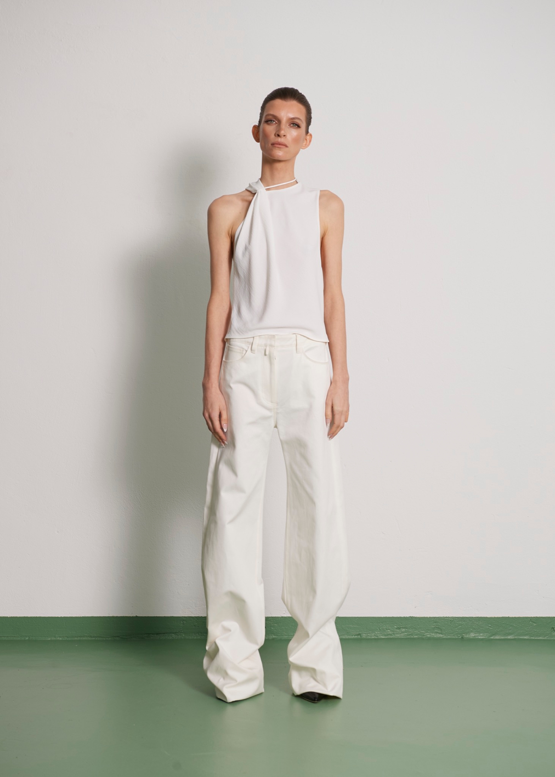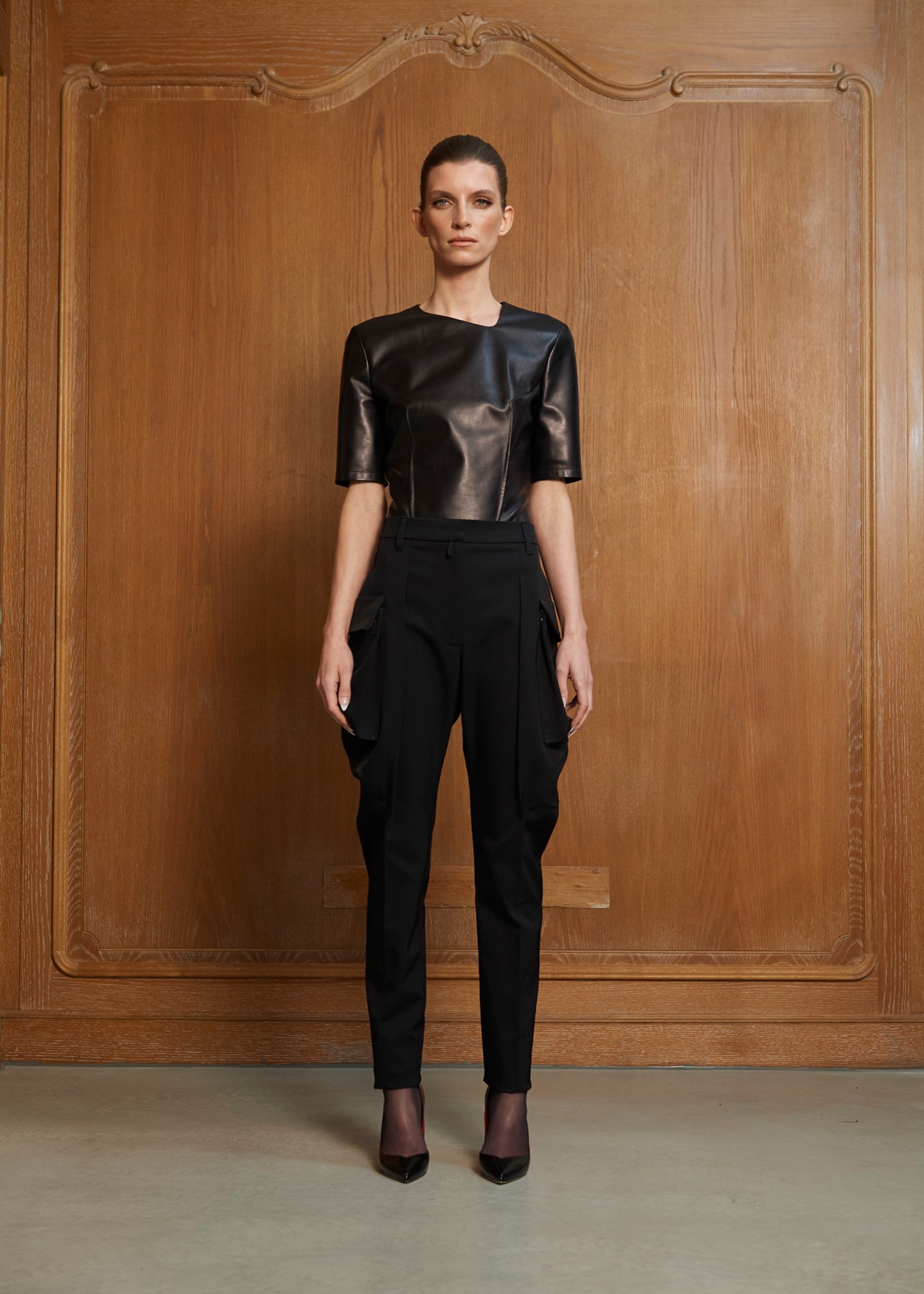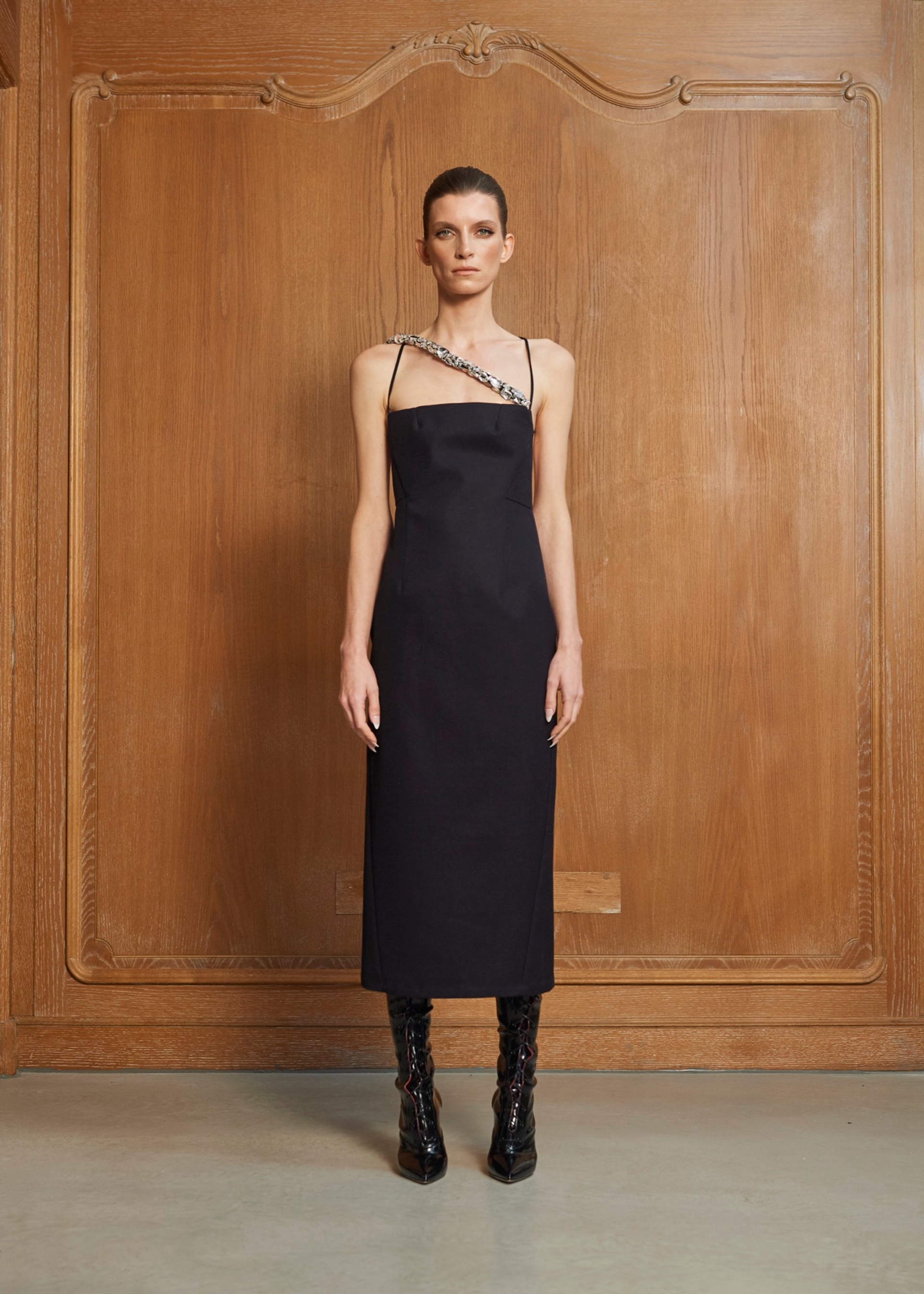 The collection emphasizes material and technical quality, which is energetically revealed and concealed. Counterintuitive pairings of fabrics and design subvert classic garments such as the white button-up shirt or the little black dress. Bonded buttons and trompe l’oeil layers in outerwear veil functional details and structure, while external darts and visible tailoring expose them. Contrasting textures and shapes pair soft draped tops and dresses with sculpted leather and canvas volumes. Fabrics associated with functional clothing are reinterpreted in elegant evening attire, referencing 032c’s background in workwear in the context of luxury standards. Asymmetrical cut-outs and lush Swarovski Crystal embellishments elevate and complicate otherwise stark silhouettes, adding a sense of accident and excess to the garments’ rigor and intention. Heritage production methods are adapted for contemporary fabrics benefiting from new technology and environmental guidelines. Ethically sourced fabrics feature prominently: a GOTS-certified fur alternative by the German brand Steiff appears as an evening dress and a classic, military-cut winter coat.
