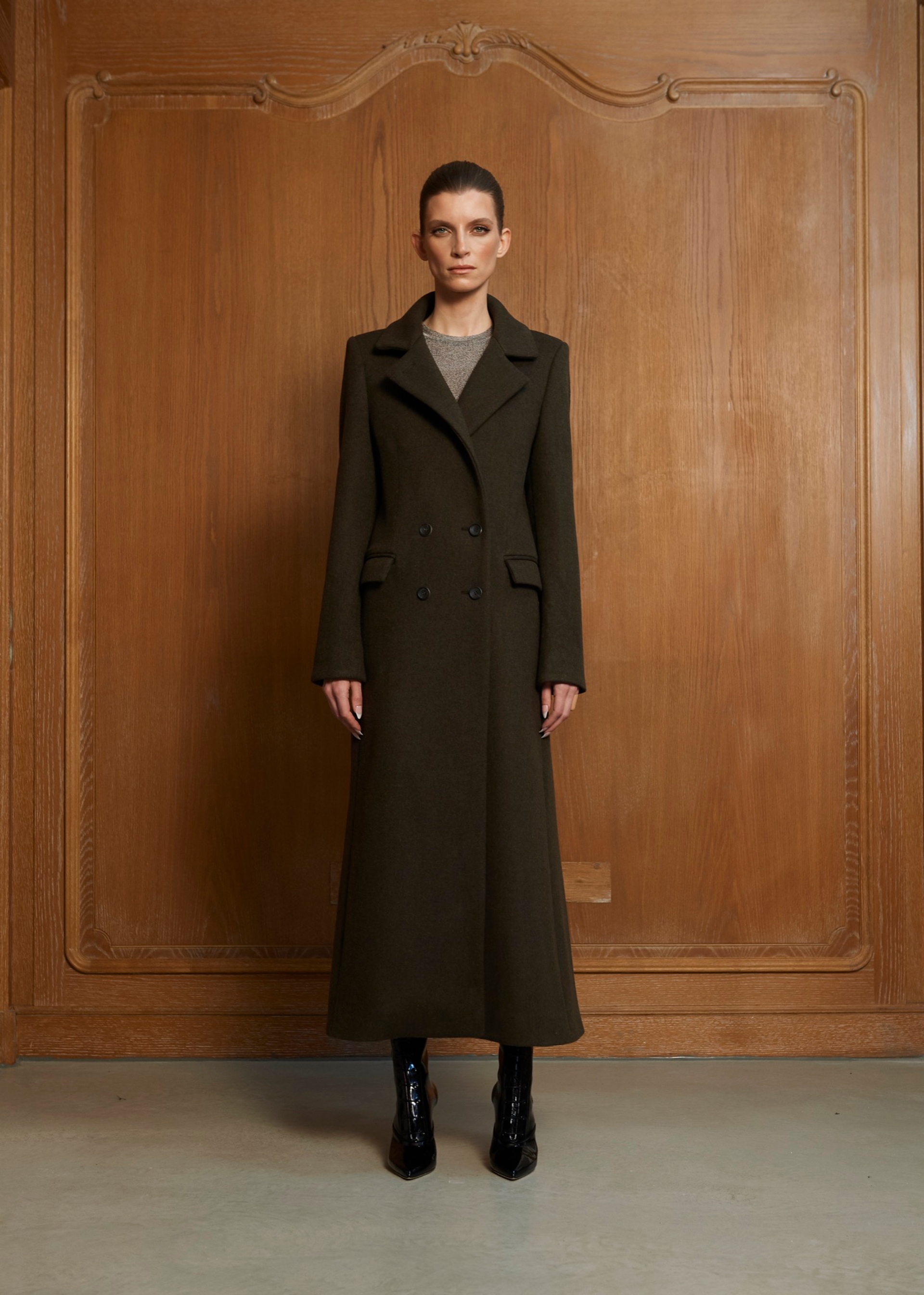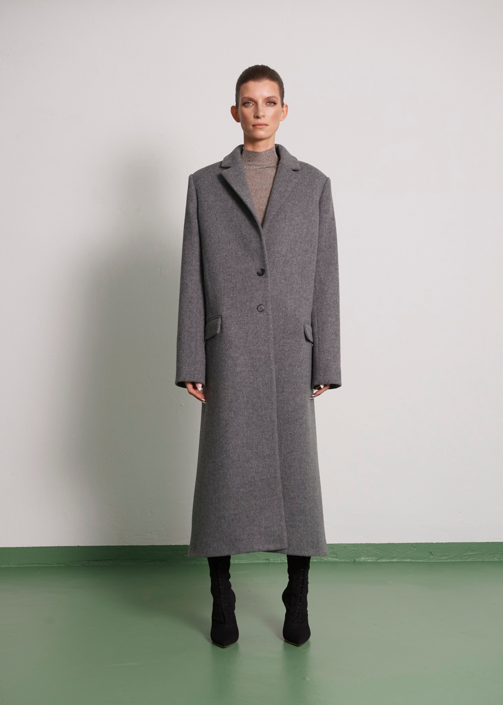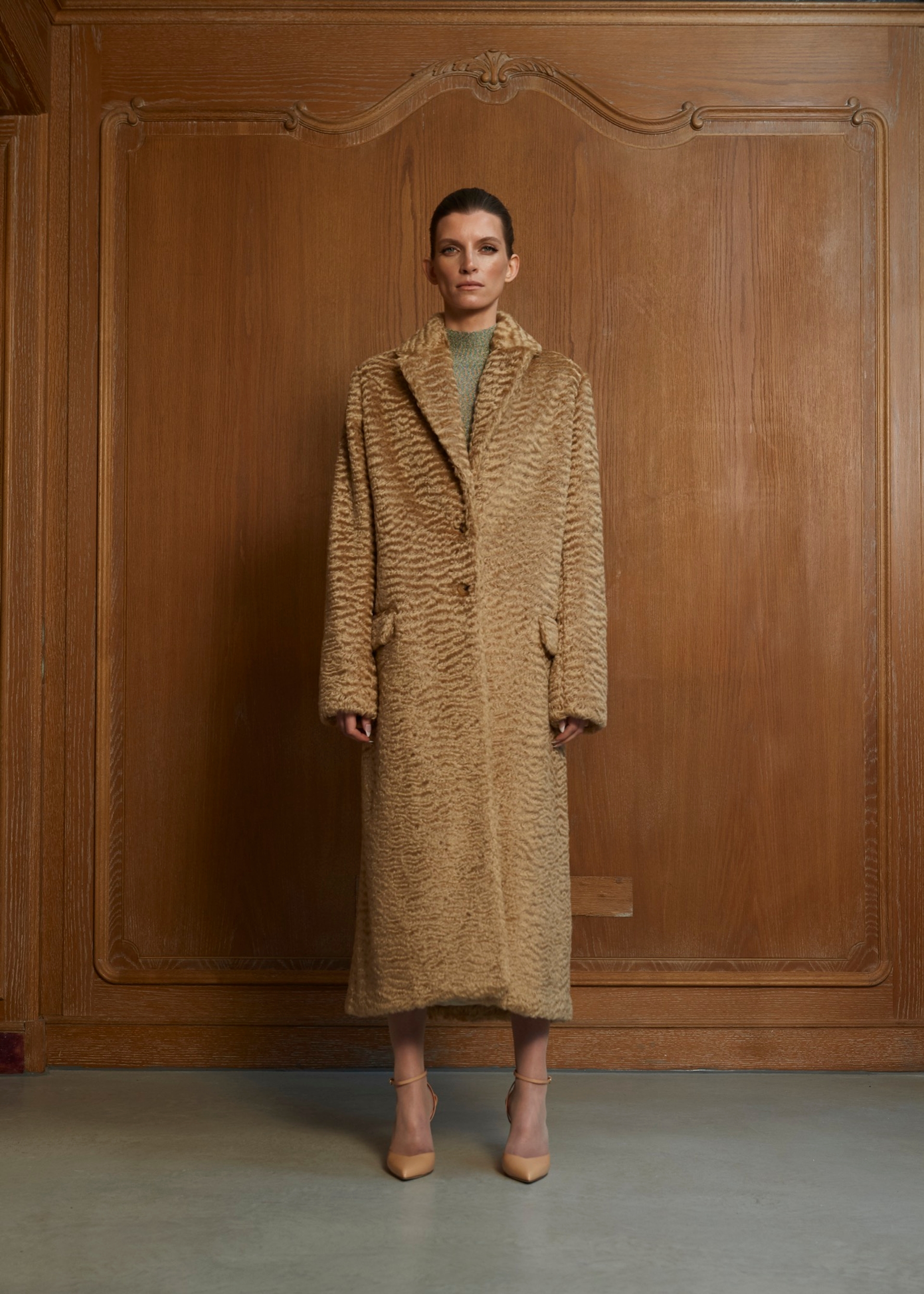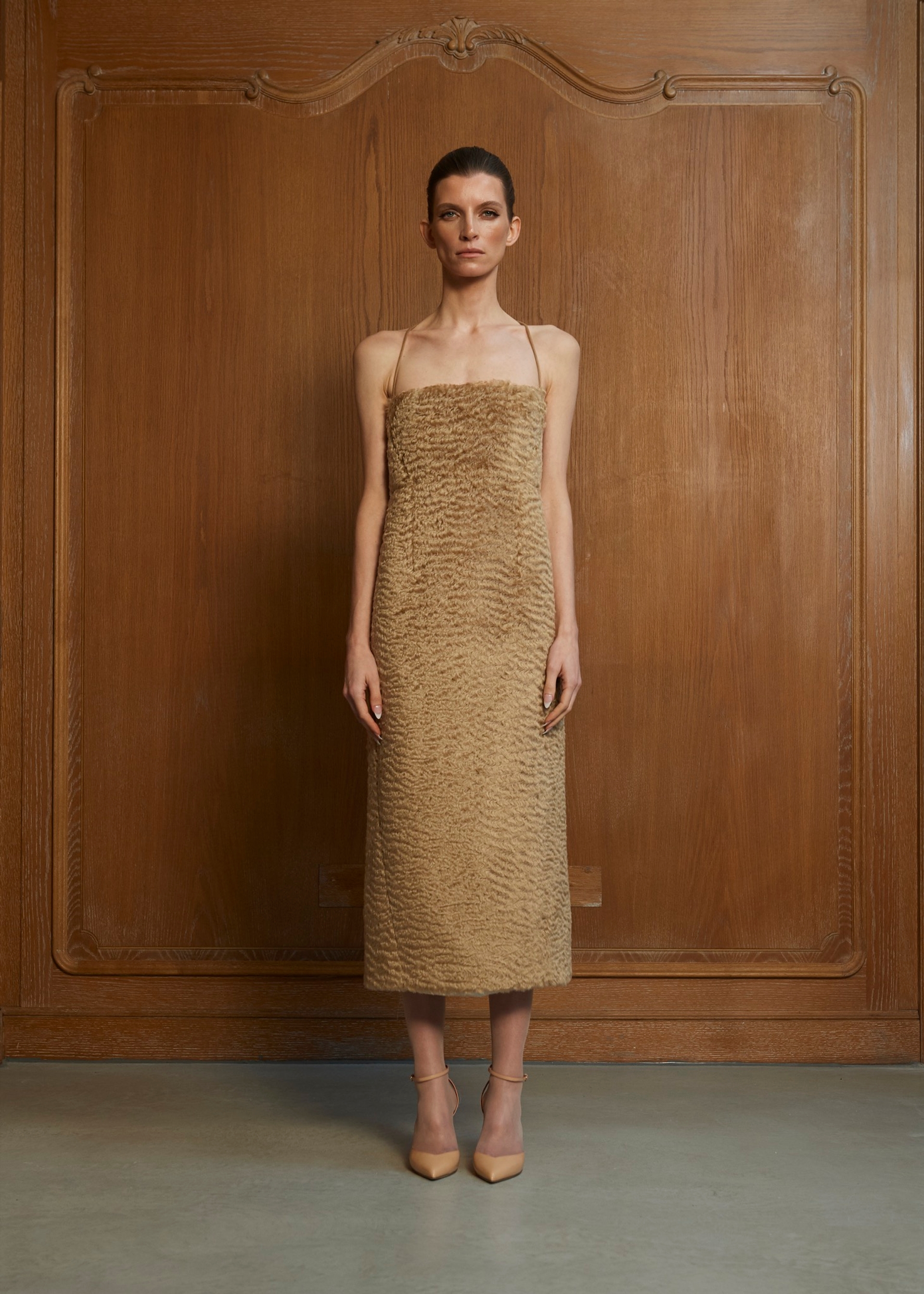 The collection emphasizes material and technical quality, which is energetically revealed and concealed. Counterintuitive pairings of fabrics and design subvert classic garments such as the white button-up shirt or the little black dress. Bonded buttons and trompe l’oeil layers in outerwear veil functional details and structure, while external darts and visible tailoring expose them. Contrasting textures and shapes pair soft draped tops and dresses with sculpted leather and canvas volumes. Fabrics associated with functional clothing are reinterpreted in elegant evening attire, referencing 032c’s background in workwear in the context of luxury standards. Asymmetrical cut-outs and lush Swarovski Crystal embellishments elevate and complicate otherwise stark silhouettes, adding a sense of accident and excess to the garments’ rigor and intention. Heritage production methods are adapted for contemporary fabrics benefiting from new technology and environmental guidelines. Ethically sourced fabrics feature prominently: a GOTS-certified fur alternative by the German brand Steiff appears as an evening dress and a classic, military-cut winter coat.