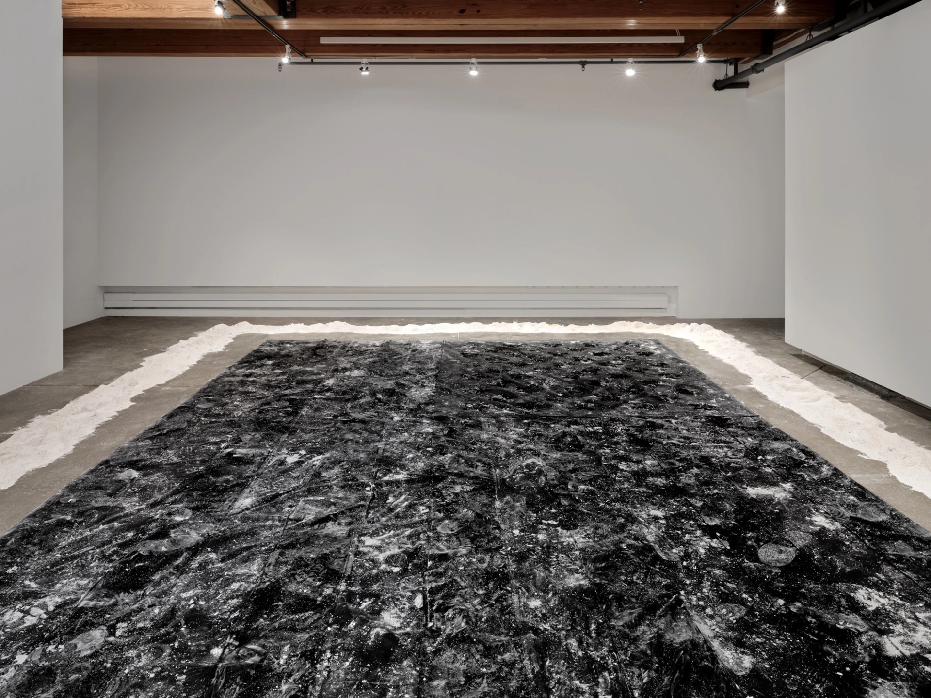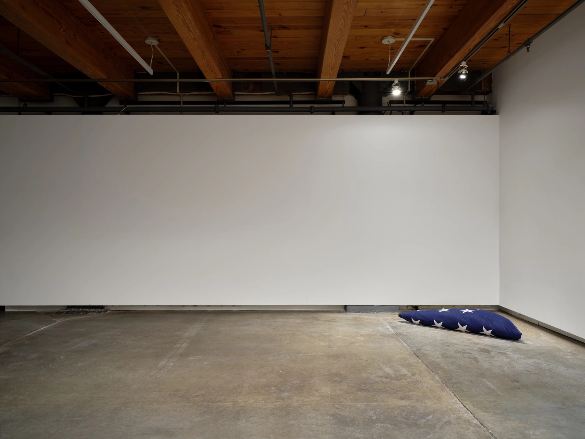 Let’s talk about the performative element of the piece, or more specifically about how you envisioned the system of viewing that the audience has to navigate. There’s this perfectly measured amount of space that makes it sort of possible to not get the chalk on your shoes if you really, really try not to. But in all likelihood, if you view the piece, you are going to get chalk on your shoes, and possibly on the flag as well. Can you tell me about the way you imagined and designed this experience?