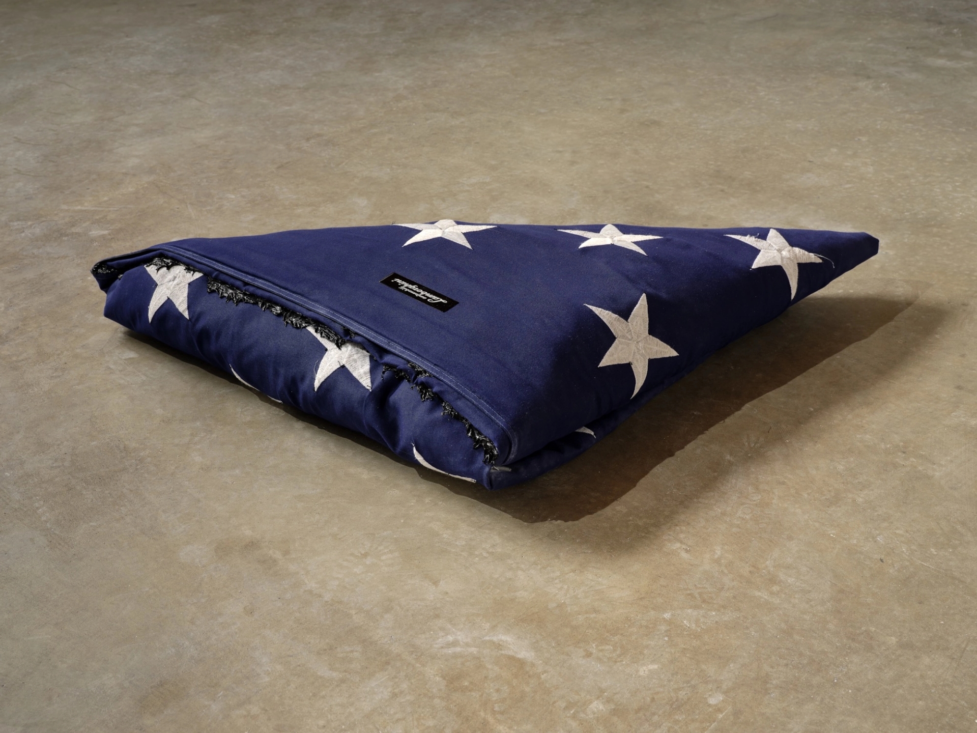 Gideon Jacobs: Let’s talk about the materials you used in the piece for anonymous gallery. You constructed the American flag, a sacred symbol of nationalism, out of products that some probably wouldn’t think of as sacred—dry ramen, Lamborghini floor mats. For the record, I personally consider ramen more sacred than the American flag.
