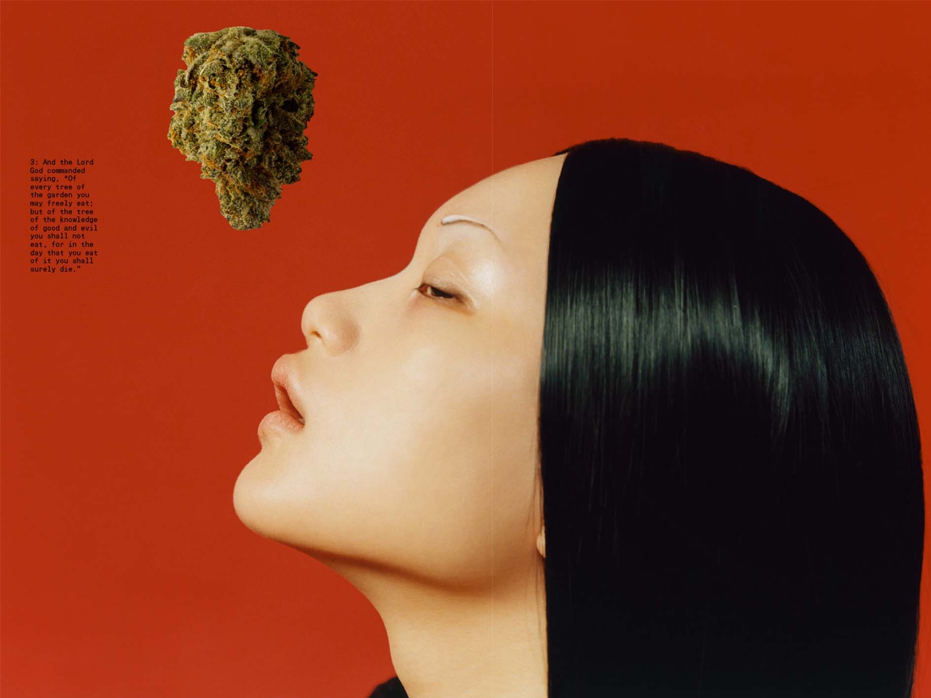 When we started working on Chapter Two, we actually had to cut a lot of things out because we were shooting in Korea, where cannabis is considered the “original sin.” For example, we couldn’t develop the weed garden we had originally planned. We had to individually make the weed plants from moss, molding clay and resin, and we ended up making 420+ little nuggets, which took almost a month. We felt there was something so carnal about this campaign that screens couldn’t capture, so we decided to do it the old school way: by shooting film, drawing out individual type with our amazing designer Corinne Ang, laying it by hand, and printing the zine. I got a few paper cuts, but I’m a survivor.