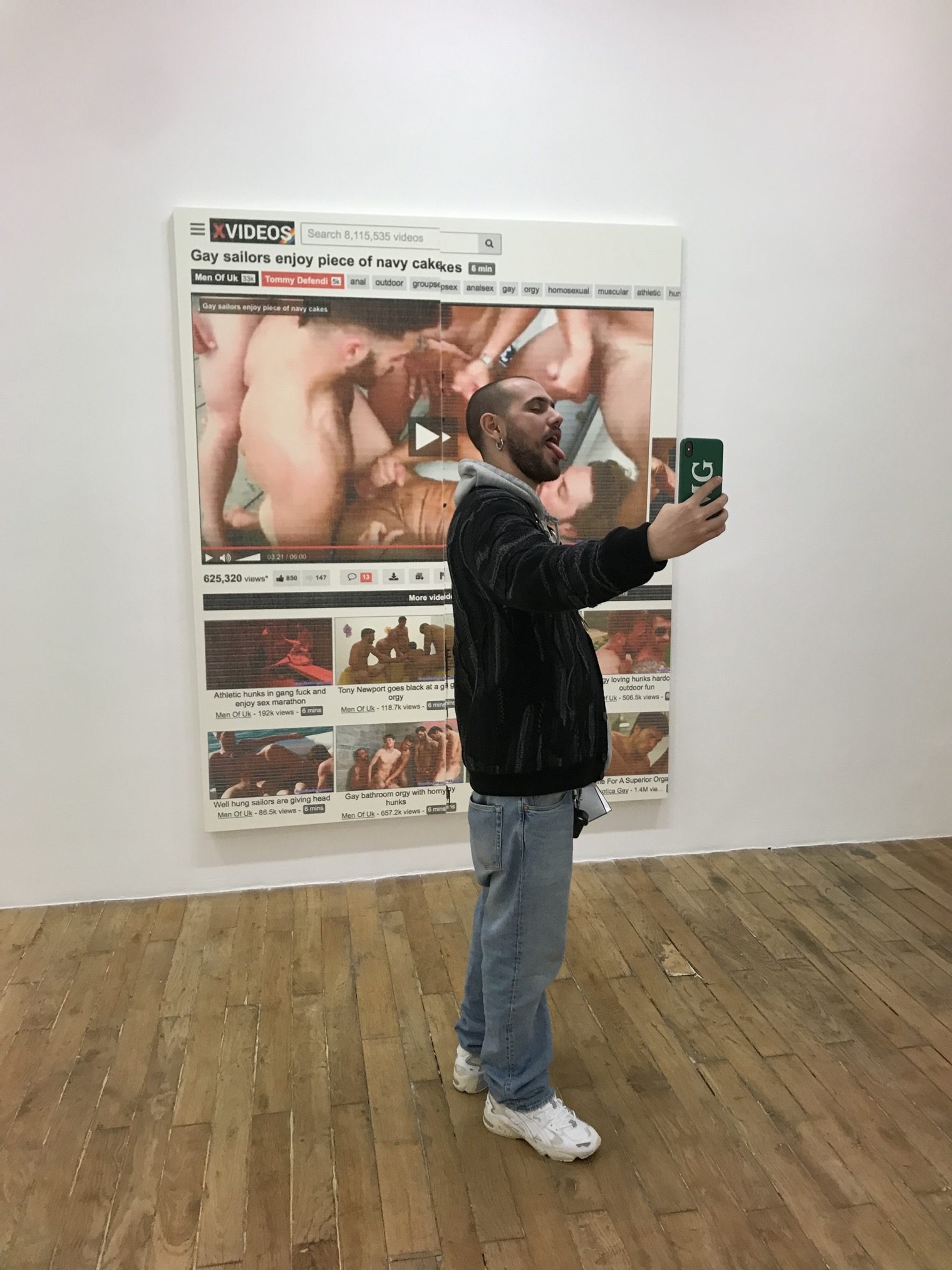 032c fashion director MARC GOEHRING has created an island on ANIMAL CROSSING, and he’s importing some of his favorite art – namely, a Wade Guyton originally exhibited at Galerie Chantal Crousel in Paris last year. In order to make the work a part of his sculpture garden, he “hand-pixelated” the work – a digital collage referencing an “XVideos.com” video called “Gay sailors enjoy piece of navy cakes” – breaking it down into 56 squares and reassembling them into eight rows of seven pieces each. Then, he created a QR code using his iPhone and uploaded it to his NookPhone, imported it into Animal Crossing and putting the artwork together one block at a time. Goehring reckons that the process took him about five hours to complete the picture, which is now the centerpiece in his cherry-blossom filled outdoor sculpture park. Several works by Guyton now populate his indoor gallery as well. See the process – and the result – below.
