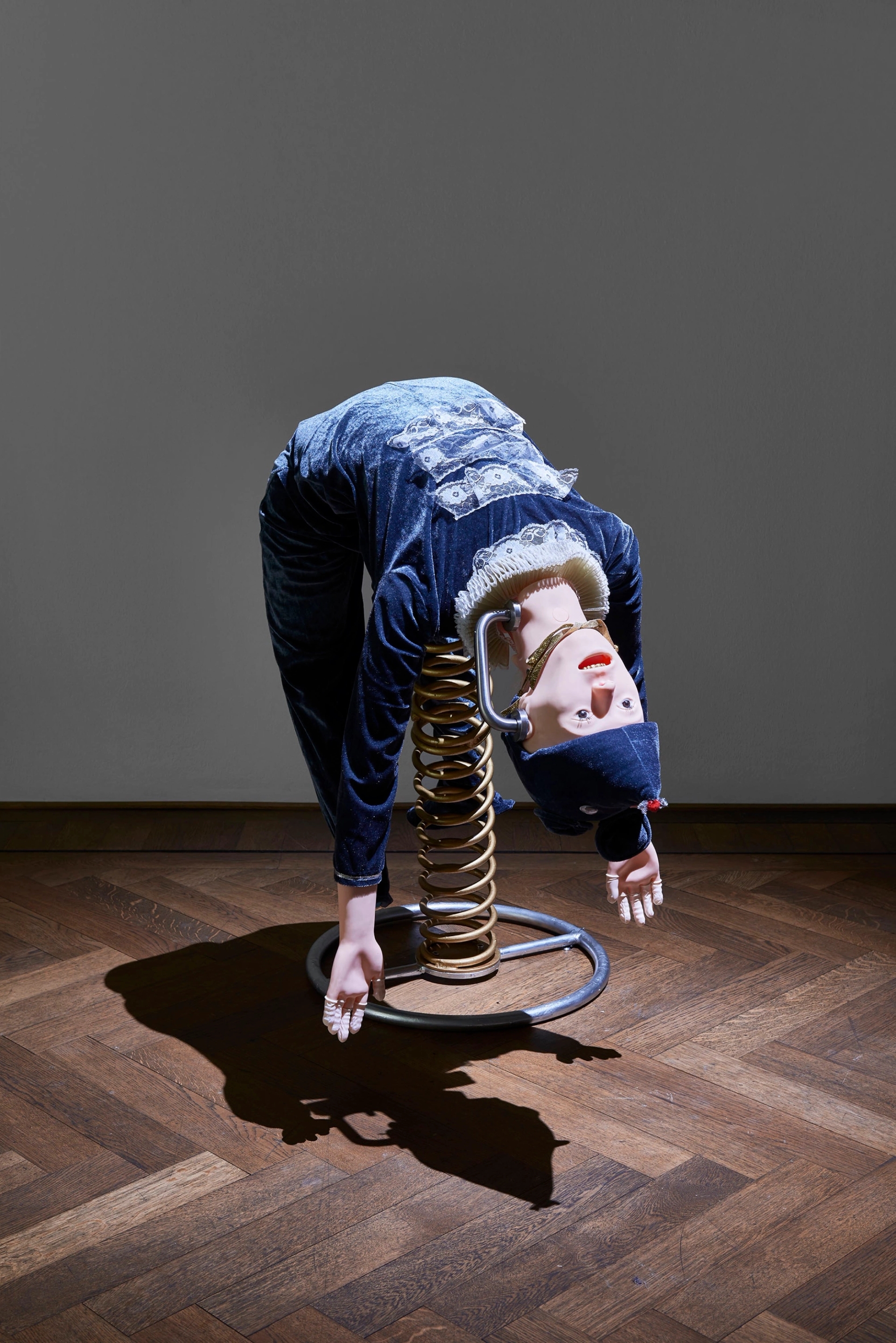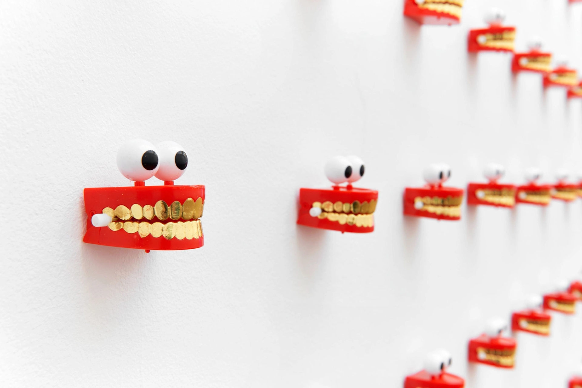 Among the many deviant funhouse objects that fill Wong Ping’s Golden Shower, newly opened at the Kunsthalle Basel in Switzerland, are roughly 4,500 sets of golden wind-up teeth. These are props from the Hong Kong native’s latest film – Dear, Can I Give You a Hand? (2018) – a macabre 12-minute animation in which a horny widow steals his daughter-in-law’s panties, is attacked by flesh-eating ants, and crushed beneath a pile of gold teeth.