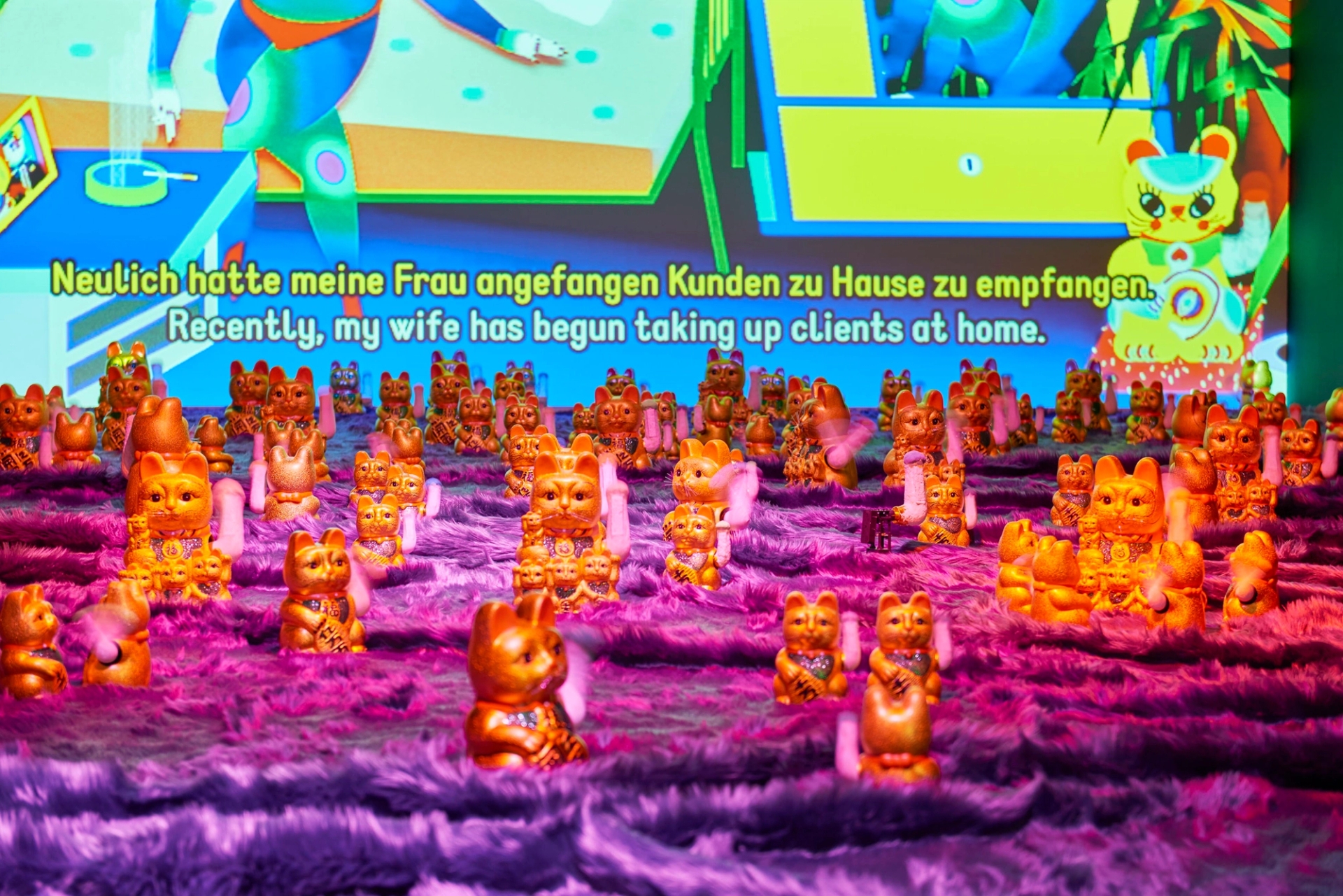 In the first room, the film Dear, Can I Give You a Hand? (2018) is showing along with an installation of around 4,500 wind-up toy gold teeth – objects which expand upon the content in the video. In the third room is my film Jungle of Desire (2015) and lucky cats with dildo hands – penis hands – which is also a concept drawn from the video. The video was inspired by reading about sex workers in Hong Kong in the newspaper. The cops were taking advantage of them, threatening to arrest them in exchange for a free service. Fortune cats are usually seen in stores where they are used to bring in custom. So in the case of sex workers I think it makes sense to put a dildo there, swinging back and forth, waving to customers. Before 2015 I would just upload videos online. Jungle of Desire was my first film for an art show. After the show I actually donated about 20 or 30 of these sculptures to a charity that helps sex workers.